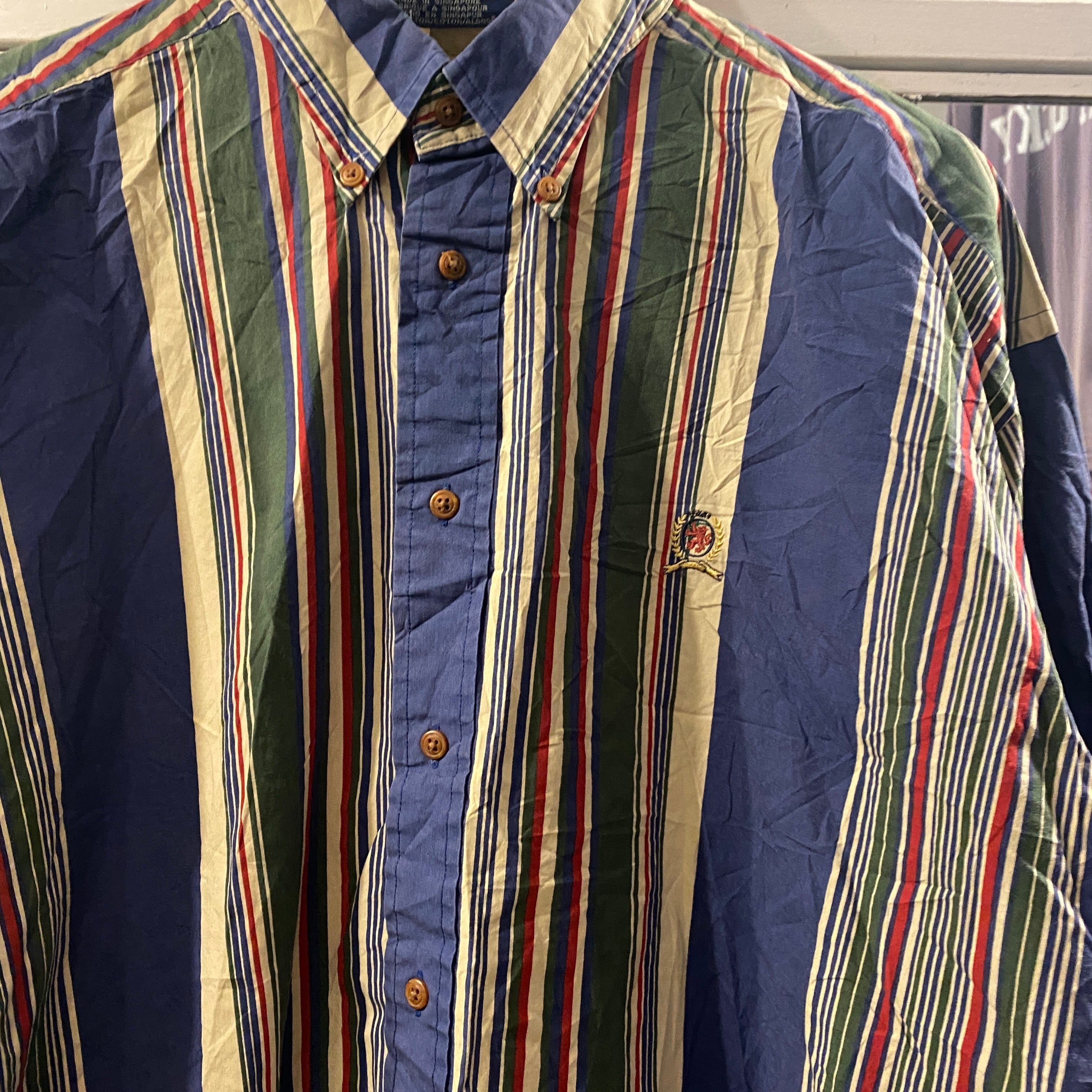 ビンテージ 90年代 トミーヒルフィガー ロゴ刺繍 ストライプ ボタンダウンシャツ XL